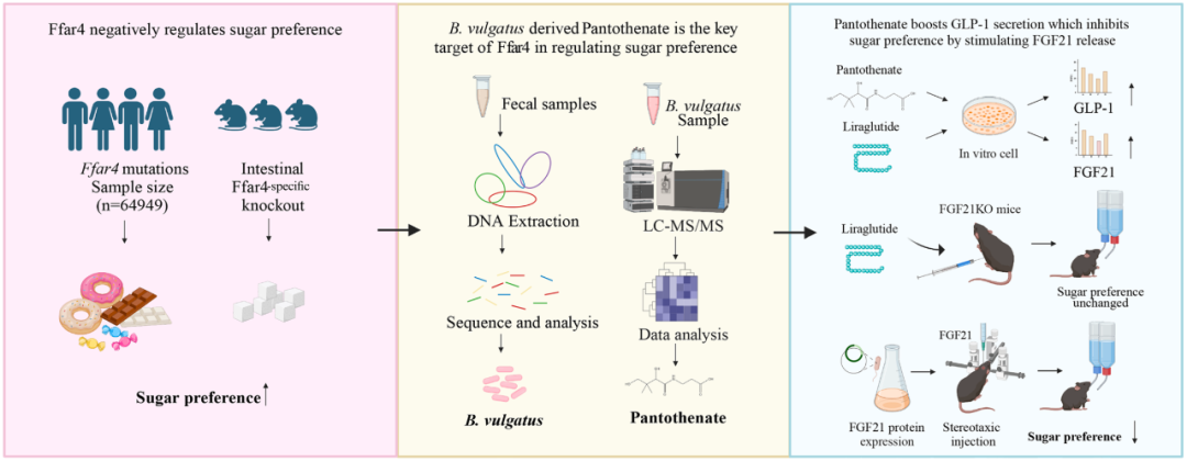 研究者对一个全基因组关联研究(GWAS)数据库进行了孟德尔分析,研究人员发现携带Ffar4基因突变的个体表现出对含糖食物(如甜味巧克力和加糖茶饮)的显著偏好。为验证这一现象,研究者构建了Ffar4基因敲除小鼠模型,观察到该品系小鼠同样出现糖类摄入量增加的行为特征。鉴于Ffar4主要在肠道组织中表达,且已有研究表明肠道微生物可调控宿主的饮食选择,研究者推测Ffar4可能通过影响肠道菌群来调节糖偏好。实验数据显示,Ffar4表达下调会导致肠道内普通拟杆菌(Bacteroides vulgatus)及其代谢产物泛酸盐的含量减少。相反,Ffar4过表达则能促进该菌群的增殖。机制研究表明,普通拟杆菌产生的泛酸盐能够有效刺激肠道L细胞分泌GLP-1,这可能是影响宿主糖代谢调控的关键途径。